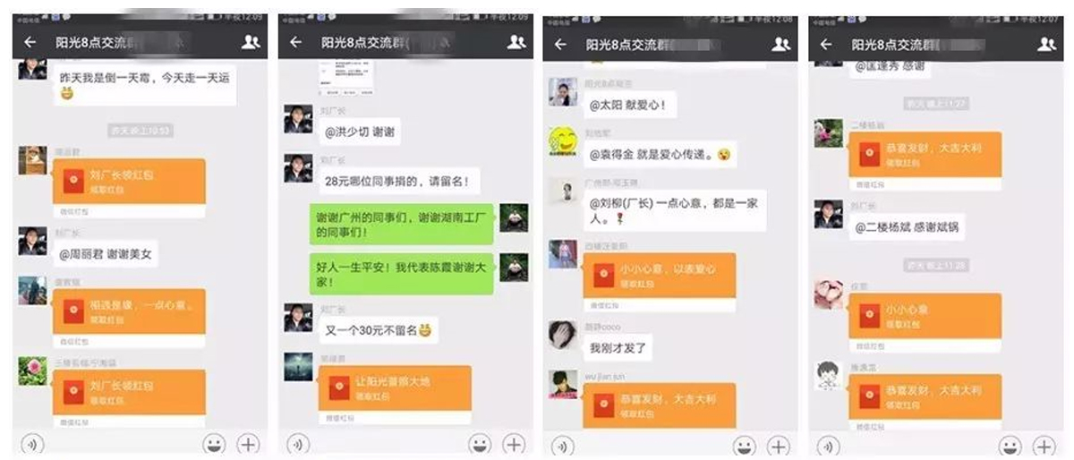 當天晚上,在貴州省陽光箱包的袁廠長走訪完陳霞的家庭并表明情況后,陽光箱包董事長袁仕偉立即決定,以陽光8點工廠名義向陳霞的家庭捐出2000塊,并號召貴州省、湖南省、廣州市的陽光8點員工行動起來,為自己公司的員工獻一份愛心。活動在群里一發起,很多陽光8點的員工紛紛響應號召。雖然那時已經很晚了,但許多員工依然很熱情地向發起人奉獻了自己的一份愛心,甚至還有一些做好事不留名的雷鋒同志。520這一天,陽光8點交流群的紅包只有一個人可以搶~因為這些紅包都是同事們對陳霞家庭的一份關愛。每一筆轉賬,每一個紅包,都承載著所有陽光8點員工的善良與愛意,這些愛匯聚在陽光8點,又傳達給需要幫助的同事。